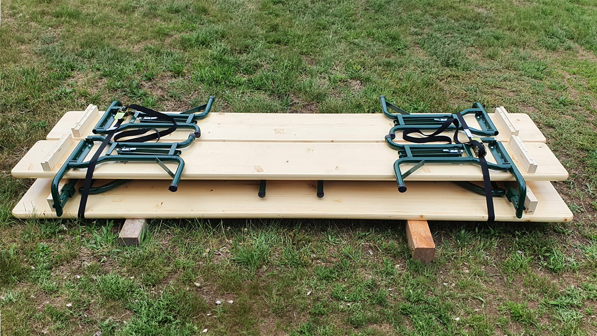 2 Klappbänke mit Rückenlehnen und Transporthölzern
